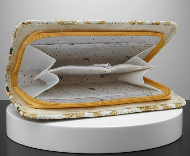 Make a statement at weddings and special occasions with this exquisite Jaipuri bag crafted with delicate floral embroidery on a pristine white background. This beautifully designed Rajasthani wedding clutch bag features intricate red and pink flowers with green and gold leaves, perfectly capturing the essence of traditional Indian artistry with a modern twist.