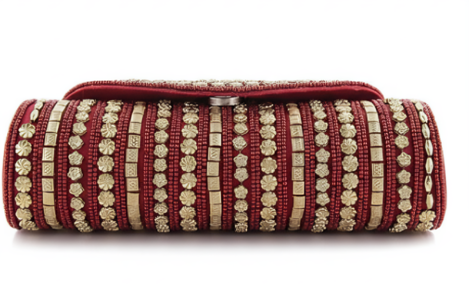 Make a statement at weddings and special occasions with this exquisite Jaipuri bag crafted with delicate floral embroidery on a pristine white background. This beautifully designed Rajasthani wedding clutch bag features intricate red and pink flowers with green and gold leaves, perfectly capturing the essence of traditional Indian artistry with a modern twist. Its compact, rectangular shape with a stunning gold frame and chain strap adds a touch of elegance to any ethnic or formal outfit.